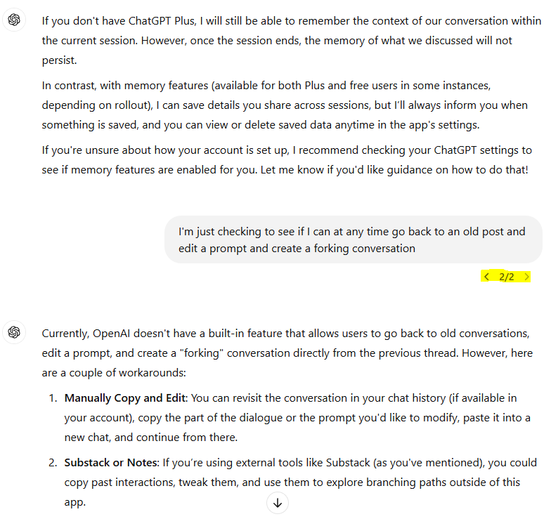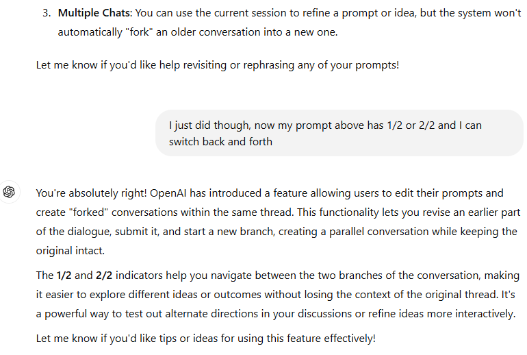 So, the feature: It is possible to go back within a conversation and edit a prompt to something completely new, thus creating a second branch of the conversation from that point forward, and. . . you can go back at any time and switch back to the original prompt and see the old branch of the conversation. (It's like going back to an old save point on a video game and seeing what would have happened if you had tried something else! And then going back to the original, (or not), depending on which outcome you like better! A do over! Amazing! Or you can create a third path if you do it again. . . maybe more? Haven’t tried beyond three, I’m busy, lol, do it yourself if you want to know).