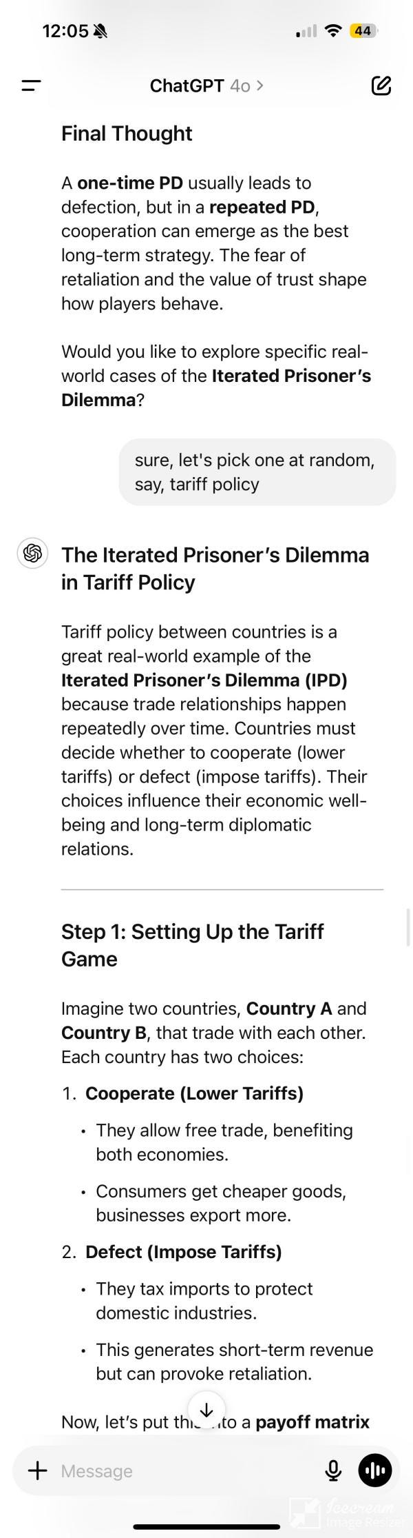 However, that only holds when you are only playing the game once. In real life an analogous game is often iterated by the same “prisoners”, (like nation-states). In this case there is an opportunity to try to cooperate in the hopes that your opponent may catch on and cooperate as well leading to a better sentence (outcome) for both of you, (1 year as opposed to 3). This is risky of course because if your opponent doesn’t cooperate you end up with 5 years or the worst result for you, while your opponent ends up the best result for them. But another nice advantage to the real world, players can communicate and form agreements, reducing the risk of defection and enabling stable cooperation. . .