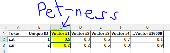 ChatGPT likes to give this example: Take the token “cat.” The first number in the vector for cat could indicate something like “pet-ness.” So, that first number in its vector is likely to be relatively high because there are strong correlations between cats and pets, right? Whereas if you take the token 'car,' that first number, which indicates pet-ness, is likely to be lower than that for 'cat,' as there aren’t as many correlations. (This part at least, is pretty intuitive I think).